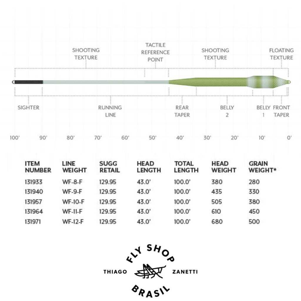 Importante: a linha é construída dois números acima do padrão — use o número designado para sua vara (se sua vara é número 8, use a linha WF8F mesmo ela sendo “pesada” para o padrão). Esse overweighting intencional carrega varas modernas de ação rápida perfeitamente e entrega poder adicional para moscas grandes. Ideal para tarpon, permit, snook, redfish, GTs, bonefish, sea trout — e no Brasil: robalos gigantes, tarpons, xaréus, camurim, pirarucu, e tucunarés-açu em condições de calor extremo onde outras linhas simplesmente não funcionam.